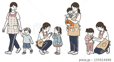 一組描繪幼兒園教師和幼兒在托兒所及學前班日常生活的插畫
