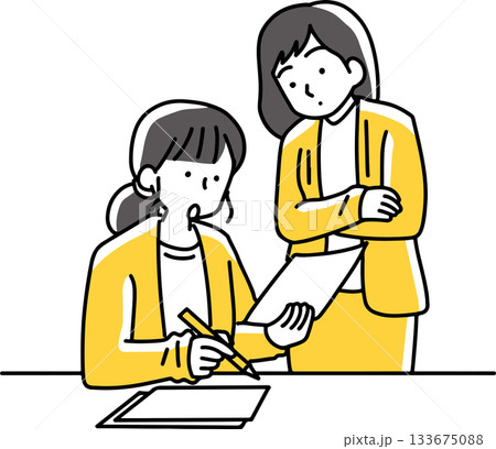 一位女性迷你角色正在為一位年輕員工提供建議(辦公室背景,中間有空白)