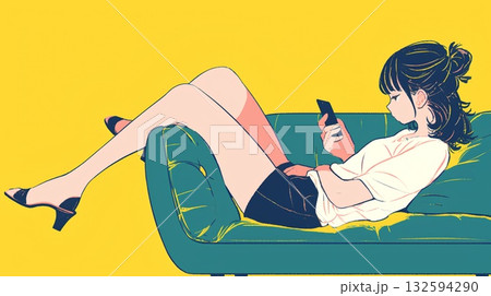 一位年輕男子坐在沙發上操作智慧型手機的插畫素材
