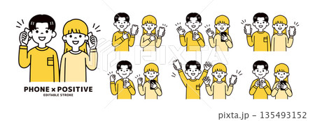 一組向量插圖素材,描繪了手持智慧型手機的積極向上的年輕男女、學生和情侶。