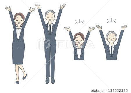 一組插圖,描繪了一群中年商務人士舉手歡慶的場景,包括全身像和上半身像。