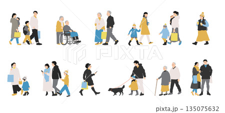 扁平化插畫:一群不同年齡的男女行走的場景。