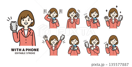 一組向量插圖素材,包含身著西裝、手持智慧型手機的女性員工的各種表情和姿勢_彩色