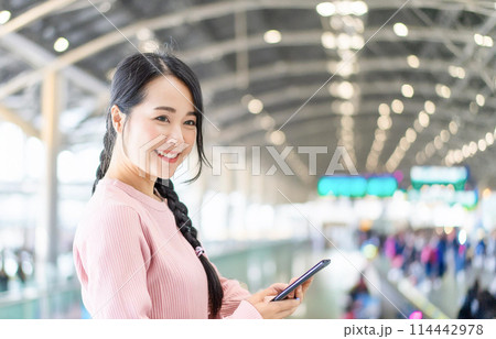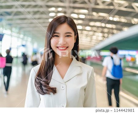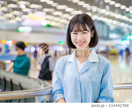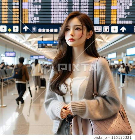 我畫了一個20歲的長髮日本美女在機場尋找登機口。