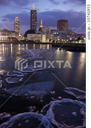 USA, Ohio, Cleveland skyline across frozen lake at sunrise