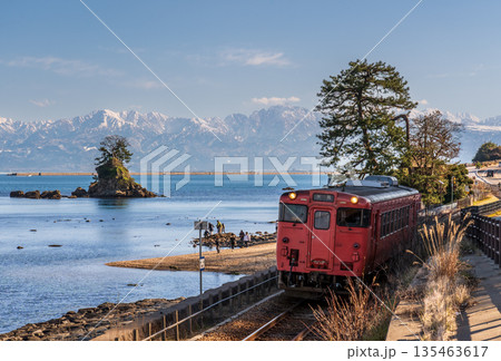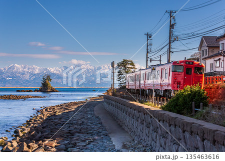 從天晴海岸眺望JR冰見線柴油列車和銀光閃閃的立山山脈