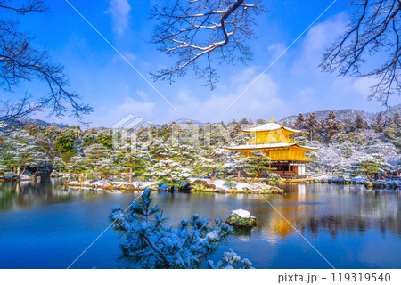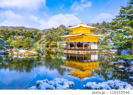 京都金閣寺冬季白雪皚皚的水鏡,世界遺產