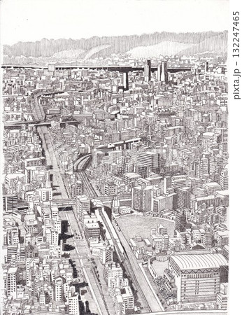 大阪摩天大樓和城堡的日本城市景觀插圖(線條畫)