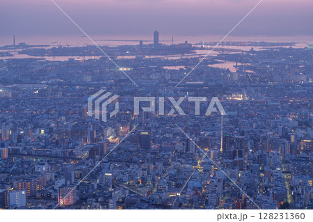 大阪府:大阪市的夜景和市中心的摩天大樓