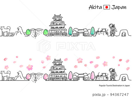秋田縣春季旅遊景點簡筆劃插畫圖