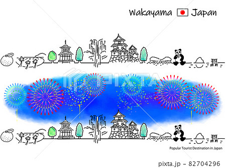 和歌山縣觀光景點的煙花和街景的簡單線條畫集