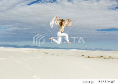 A teenage girl dancing and leaping n mid air in the open space on white sand dunes