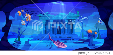 Sunken ancient temple ruins with fish