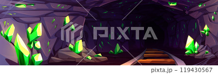 Coal mine cave with railway and crystal background