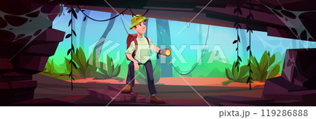 Man backpacker explore jungle forest cave vector