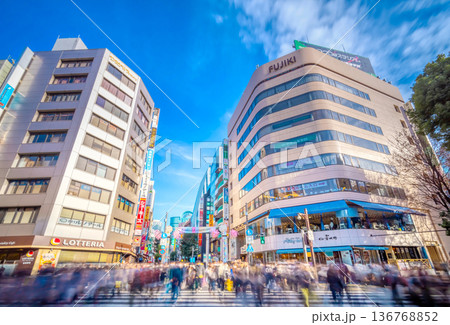 日本東京城市景觀,2 月 11 日(繁華)藍天映襯下的池袋站東口的 Hareza Ikebukuro、Animate 和其他商店