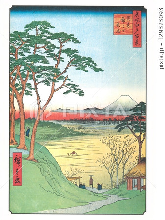 歌川廣重,《名勝江戶百景(冬篇)》第112期 目黑、太鼓橋、落日山