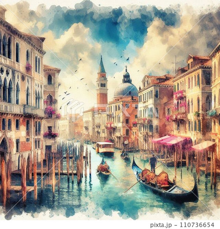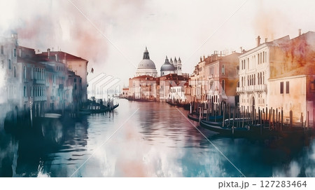 Dreamy Venice Grand Canal Watercolor Cityscape with Santa Maria della Salute Basilica
