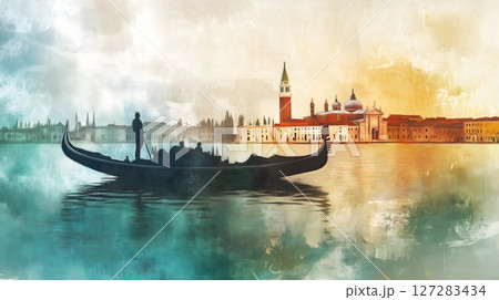 Vintage Watercolor Painting of Venice Gondola with San Giorgio Maggiore Island at Sunrise