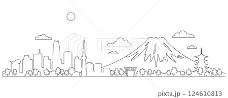 夏季東京觀光景點的城市景觀和陽光的簡單線條藝術集