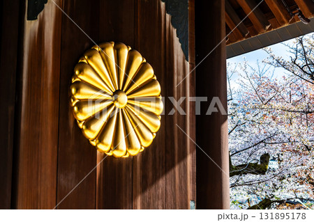 東京靖國神社:神社大門上的菊花紋章和櫻花