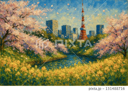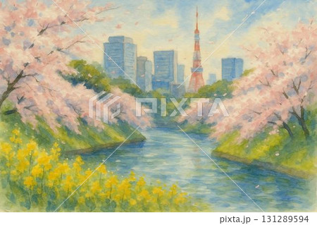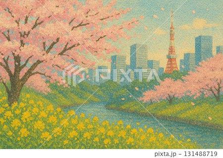 東京市中心的春天,千鳥淵:櫻花盛開,油菜花盛開,沙畫風格