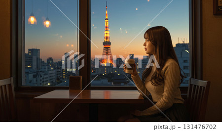 人工智慧生成的東京一家咖啡館裡一位女士享用飲品的圖像