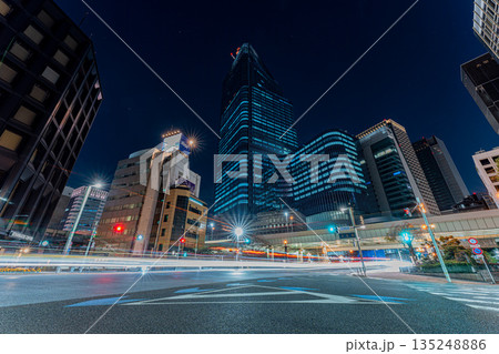東京鐵塔亮起了美國國旗的顏色,十字路口的汽車尾跡也清晰可見。