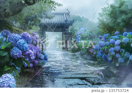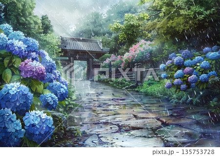 一幅水彩插畫,描繪了雨季裡,鵝卵石路上盛開著美麗而富有詩意的繡球花,這條路通往一座古老的寺廟。