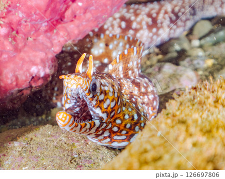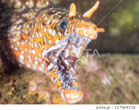 2024年,靜岡縣伊豆半島賀茂郡南伊豆町中木比里藏海灘的水下洞穴中一隻美麗的大型海鰻