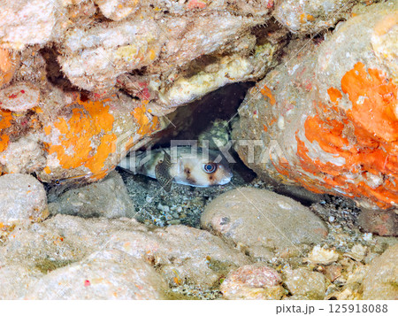 水下洞穴中的一隻大河豚。 Hirizohama Nakagi 南伊豆鎮 伊豆半島 靜岡縣 2024