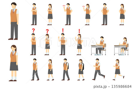 扁平化插畫:國中生套裝(冬季服裝),附臉部表情