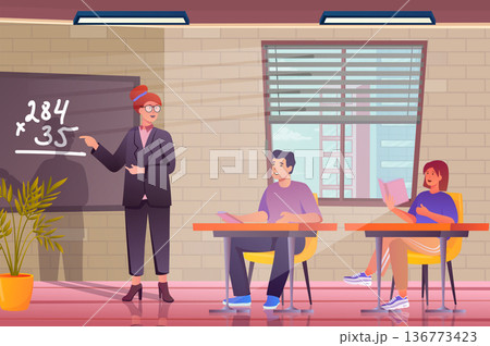 School class concept in flat cartoon design. Teenagers boy and girl sitting at desks in classroom, teacher explains lesson standing by blackboard. Vector illustration with people scene background