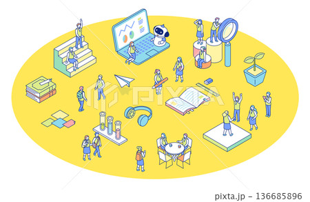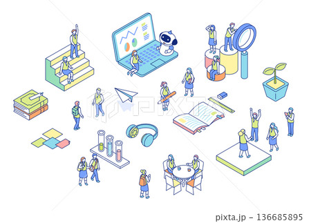 學校生活的等距視角插圖。圖中描繪了身穿制服的學生在學校學習的場景。