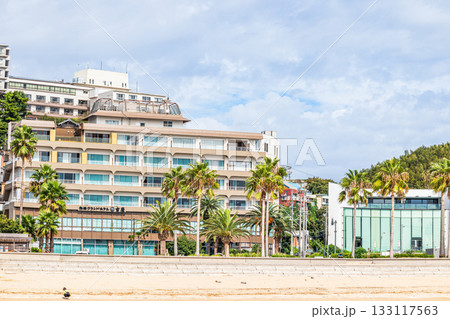 別府灣沿岸的濱海大道兩旁林立著飯店。