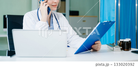 Woman doctor phone call, healthcare talking and medical service writing sick note, surgery planning and prescription.and clinical report test results