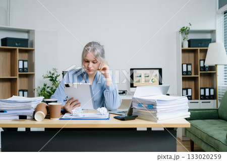 Exhausted businesswoman surrounded by documents and coffee cups, stressed from deadlines and workload. Ideal for burnout, corporate fatigue, and workplace pressure themes.