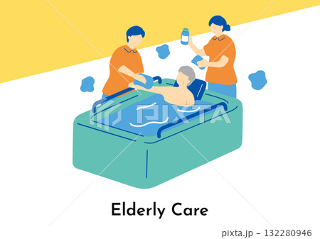 上半身插圖:護理人員協助洗澡,以及一位老人正在淋浴