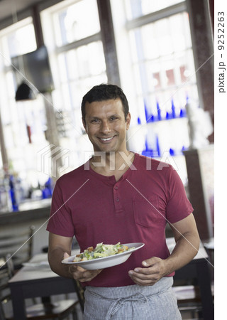 A cafe interior. A man in a waiter's apron serving a meal.