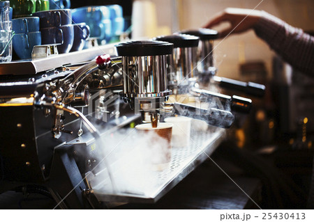 A person, barista making coffee, and frothing milk using a steam pipe, for a cappuccino. Coffee shop.