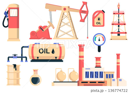Oil industry isolated elements set. Bundle of gas station, fuel canister, oil barrel, production machines, production plant and other. Creator kit for vector illustration in flat cartoon design