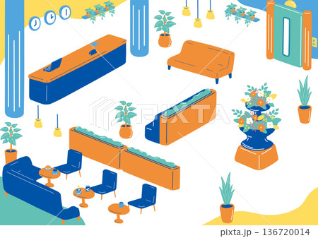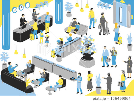 Isometric vector illustration of a luxury hotel lobby with reception and lounge area