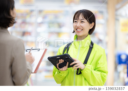 一位便利商店女店員正在店內為顧客提供服務和講解。