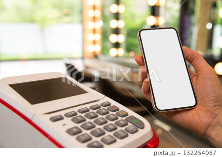 Hand swiping white credit card through payment terminal. Cashless technology and credit card payment concept.
