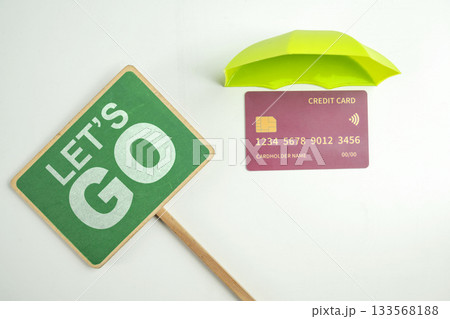 Top view of debit or credit card with green umbrella and green signboard with Let's go text on a white background. Mockup or template. Flat lay. Concept of Security, finance, and business