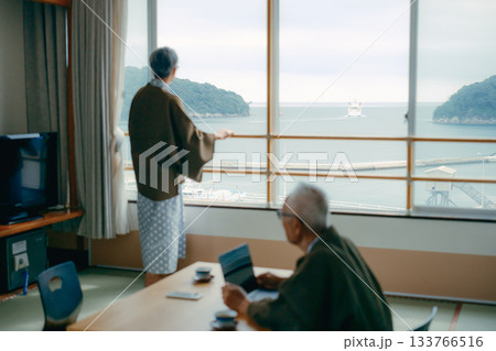 一對老年夫婦在傳統旅館的日式房間拍攝風景照。