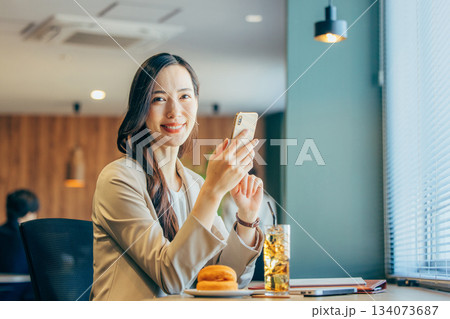 一位女商人正在共享辦公空間查看智慧型手機