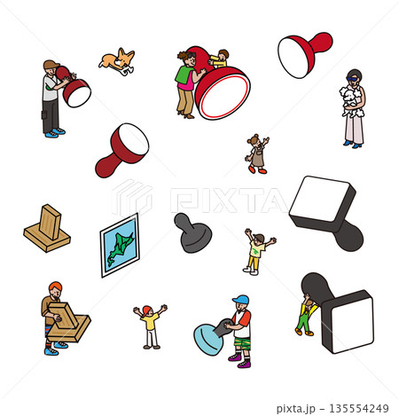 一組插圖,描繪了人們在各種活動和觀光中覆蓋各種印章的場景。