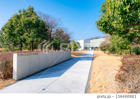 晴空萬裡,雲朵點綴著福岡市立博物館