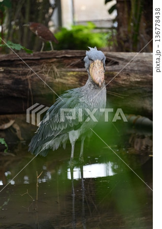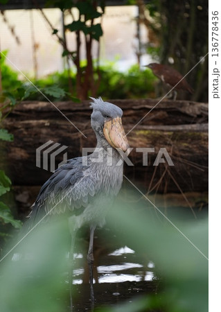 一隻鯨頭鸛站在水邊的肖像,來自神戶動物王國